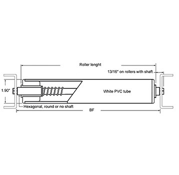 White PVC Rollers, Type 1, tru bore, 1.90" outside diameter, ABS End plugs, UHMW inserts, offered with or without spring loaded shaft in Stainless steel (1/2", 5/8" or 7/16" hexagonal)