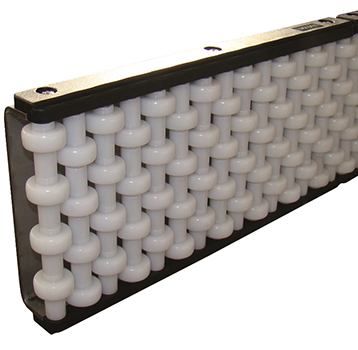 Guide Latéral à Roulettes, Série 128-3, avec 3 rouleaux par rangée, offert en longueur de 1M, 2M, ou 3M. Chassis en acier inoxidable, rouleau en Delrin (POM), et cotés sont fait en polyamide (Nylon PA).